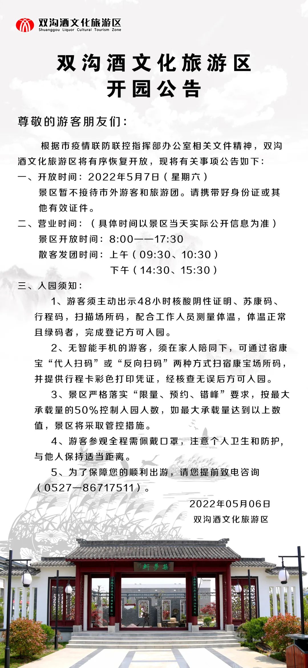 通知丨雙溝酒文化旅游區開園提醒發布日期:2022-12-12尊敬的游客朋友們:雙溝酒文化旅游區于12月09日起正式開園。...更多 >>