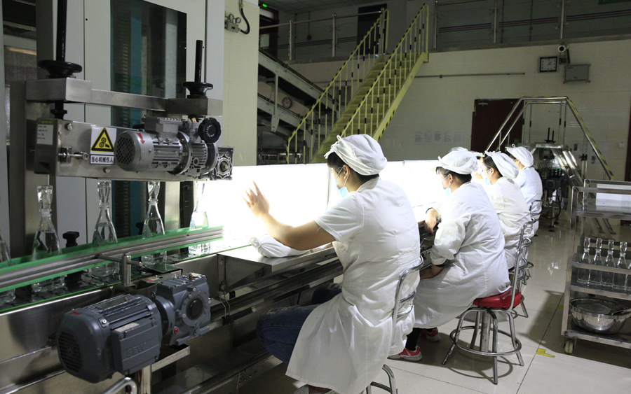 We now get to the Packaging Workshop No 1, with 7 modern assembly lines inside, each line with modern automatic equipment and intelligent induction-filling machines which work at the speed of 20,000 bottles per hour and integrate automatic filling, cap sorting and cap rotating.