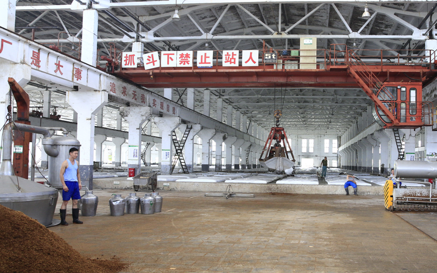 按照要求破碎好的原料就會運送到生產現場與窖池里發酵好的酒醅進行配料, 配好原料就要進行裝甑的工藝了,由一到兩名工人用鐵锨將酒醅裝到甑桶里,待到甑滿時便加蓋蒸煮,進入蒸餾、接酒階段。